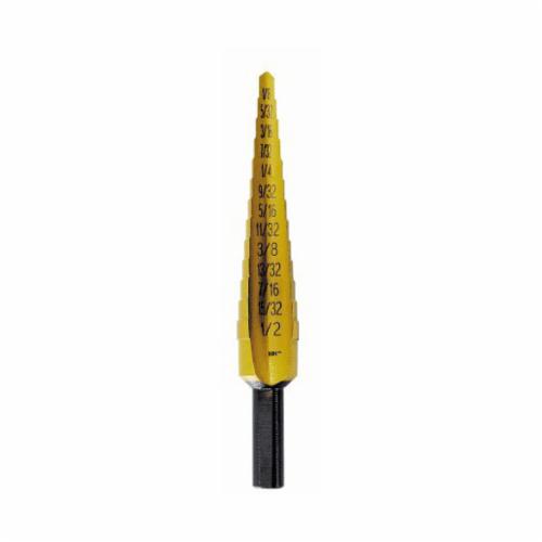 Irwin Unibit Step Drill Bit, Imperial, 1/8 in Diameter Minimum Hole, 1/2 in Diameter Maximum Hole, 3-1/4 in Overall Length, 13 Steps, 1/32 in Step Depth, 13 Hole, 1 Flutes, 1/4 in Shank, Hex Shank, Self-Starting SpeedPoint Point, HSS Cutting Edge, HSS, TiN Coated, Applicable Materials: Aluminum, Brass, Copper, Laminates, Plastic and Stainless Steel