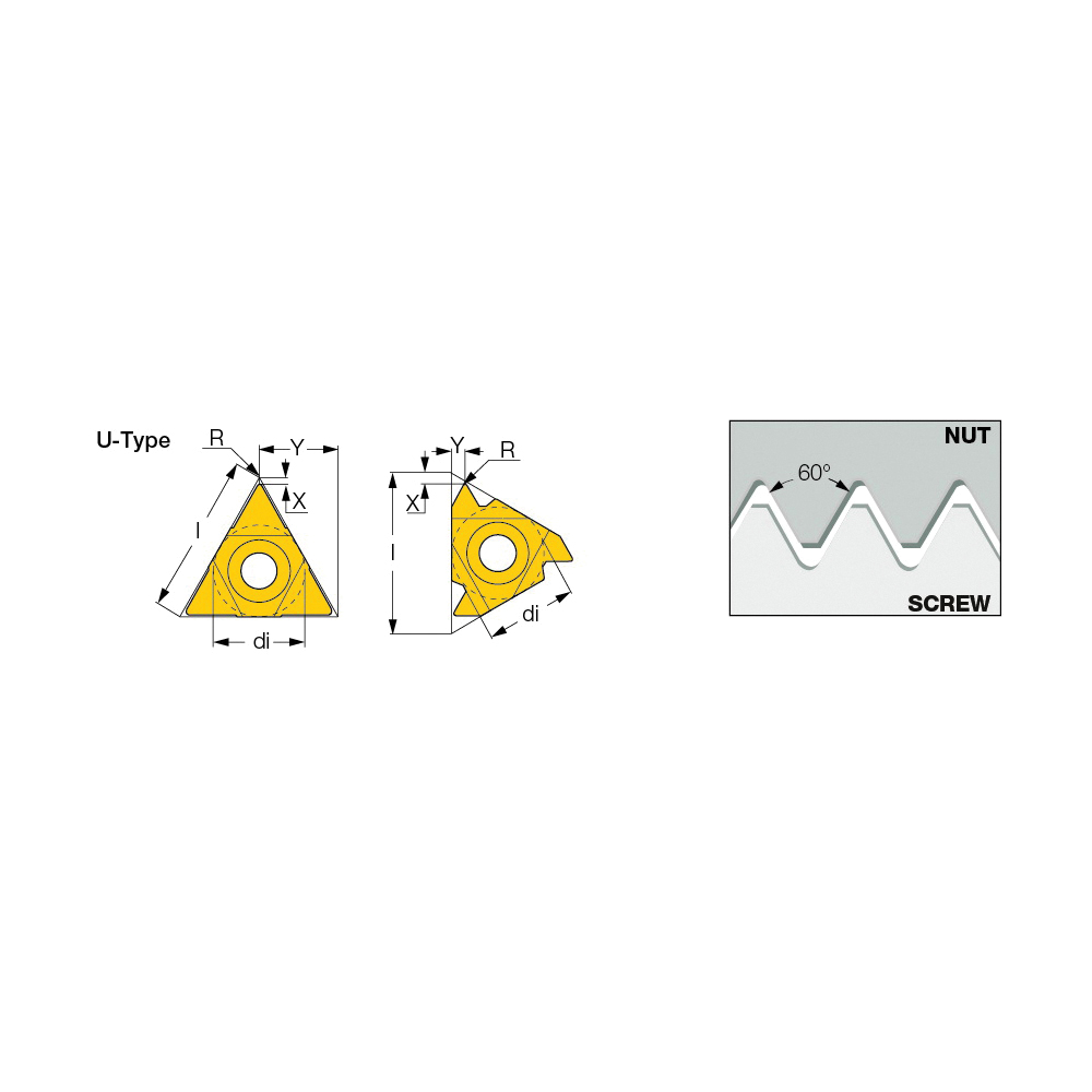 Iscar Threading Insert, Laydown, Series: ISCARTHREAD, 22IRMN Insert, 22 Insert, Triangular Shape, Internal Thread, 60 deg Partial Profile Thread Standard, 3.5 to 5 mm Pitch, 5 to 7 Threads per Inch, 12.7 mm Inscribed Circle, 4.77 mm Thickness, 22 mm Length, ISO Code: 22IRM N 60 IC908, M Chipbreaker, 0.19 mm Corner Radius, 60 deg Included Angle, Manufacturers Grade: IC908, Right Hand Cutting Direction, Carbide, PVD-TiAlN Coated, Material Grade: H, K, M, P, S