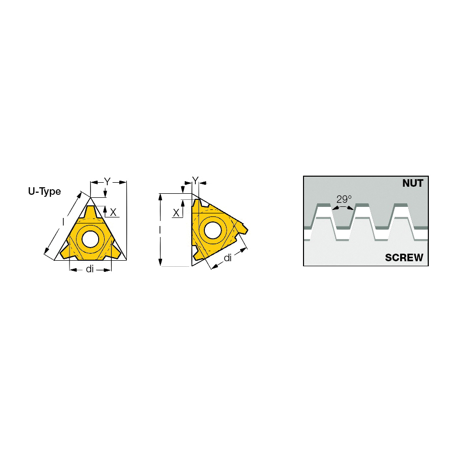 Iscar Threading Insert, Laydown, Series: ISCARTHREAD, 16ER Insert, 16 Insert, Triangular Shape, External Thread, Acme Thread Standard, 10 Threads per Inch, 9.52 mm Inscribed Circle, 3.63 mm Thickness, 16.49 mm Length, ISO Code: 16ER 10 ACME IC250, 60 deg Included Angle, Manufacturers Grade: IC250, Right Hand Cutting Direction, Carbide, PVD-TiCN+TiN Coated, Material Grade: M, P