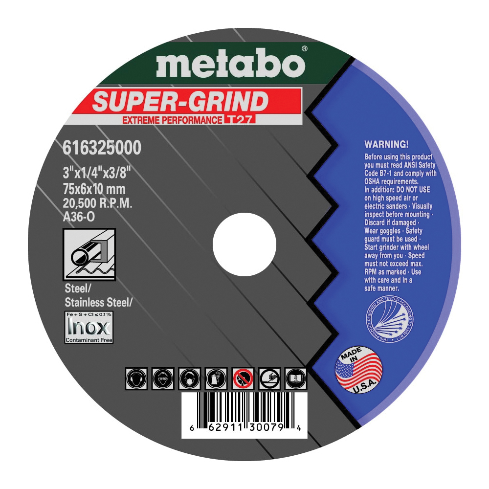 metabo Depressed Center Wheel, Contaminant-Free Extreme Performance Heavy Duty, Series: Super-Grind, 3 in Wheel Diameter, 1/4 in Wheel Thickness, 1/8 in Center Hole, Arbor Connector, A36O Grit, Medium Grade, Aluminum Oxide Abrasive, Wheel Type Number: Type 27, 20500 rpm Maximum, Resin Bond, Applicable Materials: Hardened Metals, Stainless Steel, Steel, High Tensile Alloy, Hastalloys, Inconel and Titanium, Wheel Hardness: O, Black Wheel, Yes Reinforced