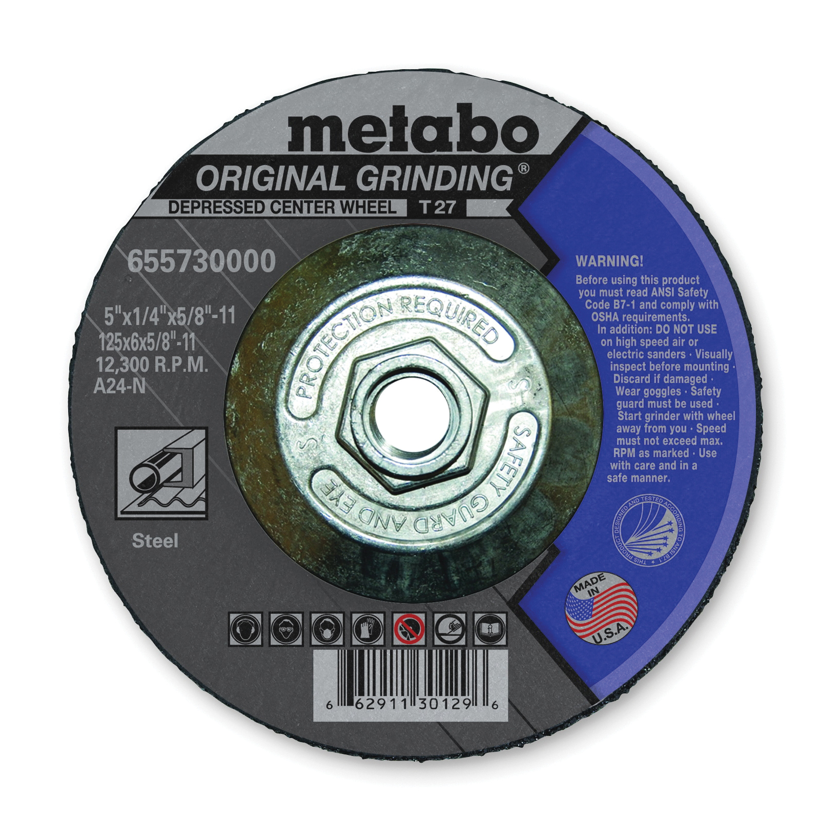 metabo Depressed Center Wheel, General Purpose, Series: Original Grinding, 5 in Wheel Diameter, 1/4 in Wheel, Thread Connector, A24N Grit, Coarse Grade, Aluminum Oxide Abrasive, Wheel Type Number: Type 27, 12300 rpm Maximum, Resin Bond, Applicable Materials: Steel and Ferrous Metals, 5/8-11 Center Hole Thread, Wheel Hardness: N, Black Wheel, Reinforced: Yes