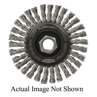 Osborn Wheel Brush, High Speed Small Grinder, 4 in Brush Dia, Arbor Hole Size 3/8-24, Stringer Bead Knot Filament/Wire, 0.02 in Filament/Wire, Stainless Steel Fill, 7/8 in Trim Length, 20000 rpm Maximum, Threaded Arbor Attachment