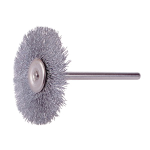 Osborn Wheel Brush, Miniature, 3/4 in Brush Dia, Crimped Filament/Wire, 0.003 in Filament/Wire, Natural Fiber Fill, 2500 rpm Maximum, Stem Attachment, 3/32 in Shank Dia