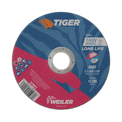 Tiger Cut-Off Wheel, Flat Long Life Performance Line Reinforced Small Thin, 5 in Wheel Dia, 0.045 in Wheel Thickness, 7/8 in Center Hole, A60T Grit, Medium Grade, Premium Aluminum Oxide Abrasive, 12200 rpm Maximum, Resin Bond, Applicable Materials: Carbon Steel, Structural Steel, Cast Iron and General Purpose Metals, Wheel Type Number: Type 1, Wheel Hardness: T, For Use With: Cut-Off Die Grinder, Right Angle Air Die Grinder and Right Angle Grinders, Yes Reinforced, ANSI B7.1-2010 Specifications Met