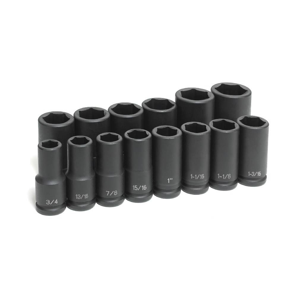 GP Socket Set, Deep Length, Yes Impact Rated, Measurement System: Imperial, 14 Piece, 6 Points, Included Socket: 3/4 to 1-5/8 in, 3/4 in Drive, Molded Storage Case Container