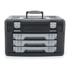 - Three drawer storage box with independent sliding drawers, locking side flaps, a steel hinged lid and a durable handle