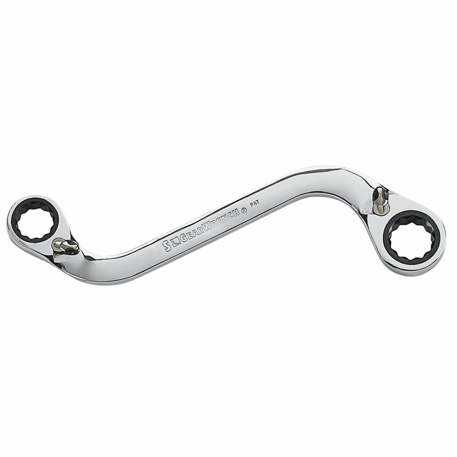 GEARWRENCH Box End Wrench, Double Slim, Measurement System: Imperial, Reversible Ratcheting Wrench, 5/8 x 11/16 in Wrench Opening, 12 Points, 8.114 in Overall Length, 0 deg Offset, 1.307 x 1.201 in Box End Width, 0.421 x 0.406 in Box End Thickness, S-Shape Handle Bend, High Alloy Steel, Polished Chrome