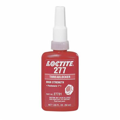 Loctite Threadlocker, High Strength Large Bolt Medium Viscosity, Series: 277, Bottle Container, 50 mL Container, Methacrylate Base, Liquid Form, 60 min Drying, 60 min Setting, 24 hr at 77 deg F (Full) Curing, Red, -65 to 300 deg F, 1.1 Specific Gravity, >199.94 deg F Flash Point, 7000 cPs Viscosity, Applicable Materials: Metal, 1300 psi Shear Strength