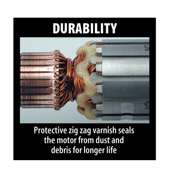 - Durability - labyrinth construction, zig-zag varnish and thicker coil wires for longer tool life
