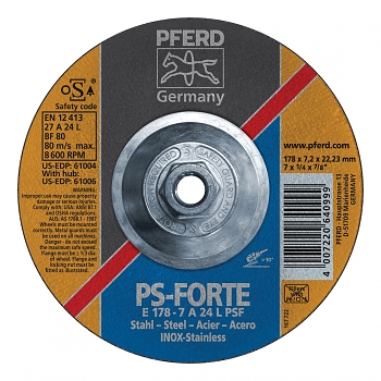 PFERD Universal Line PS-FORTE Depressed Center Wheel, 7 in Wheel Dia, 1/4 in Wheel Thickness, 24 Grit, Coarse Grade, Aluminum Oxide Abrasive, Wheel Type Number: Type 27, 8600 rpm Maximum, Resin Bond, Applicable Materials: Steel, Stainless Steel (INOX) and Cast Iron, 5/8-11 Center Hole Thread Size, Wheel Hardness: L, ANSI Specified Specifications Met