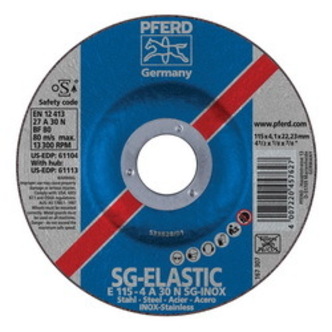 PFERD Depressed Center Wheel, Series: Performance Line SG, 4-1/2 in Wheel Dia, 1/8 in Wheel Thickness, 7/8 in Center Hole, 30 Grit, Super Fine Grade, Aluminum Oxide Abrasive, Wheel Type Number: Type 27, 13300 rpm Maximum, Resin Bond, Applicable Materials: Carbon Steel and All Ferrous Metals, Wheel Hardness: N, Yes Reinforced, ANSI Specified Specifications Met