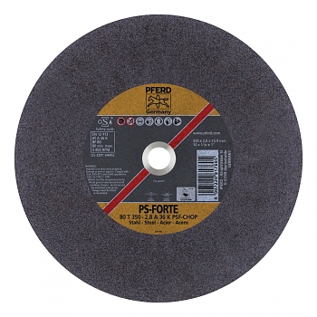 PFERD Cut-Off Wheel, Type 1, Series: Universal Line PS-FORTE, 14 in Wheel Dia, 3/32 in Wheel Thickness, 1 in Center Hole, 36 Grit, Extra Coarse Grade, Aluminum Oxide Abrasive, 4400 rpm Maximum, Applicable Materials: Steel, Wheel Type Number: Type 1, Wheel Hardness: K, For Use With: Portable Chopsaws, Yes Reinforced
