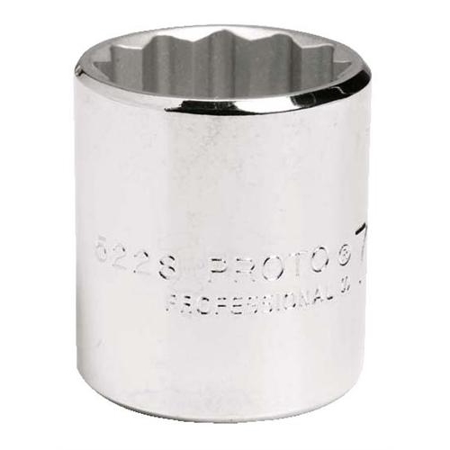 Proto TorquePlus Socket, Standard Length, No Impact Rated, Measurement System: Imperial, Square Drive, 3/8 in Drive, 11/16 in Socket, 1-1/8 in Overall Length, 17/32 in Opening Depth, 61/64 in Drive End Width, 61/64 in Socket End Width, Ball Locking, 12 Points, 11/16 in Bolt Clearance Depth, Alloy Steel, Full Polished