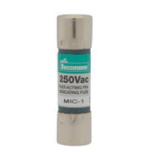 Bussmann Midget Fuse, Fast Acting, Series: MIC, Indicating/Non-Indicating: Indicating, 10 A, 250 VAC, 200 A Interrupt, Class: Supplemental, Ferrule Terminal, Holder Mount, Cartridge Body, Fiber Tube, Green, 13/32 in Dia x 1-1/2 in L Body Size
