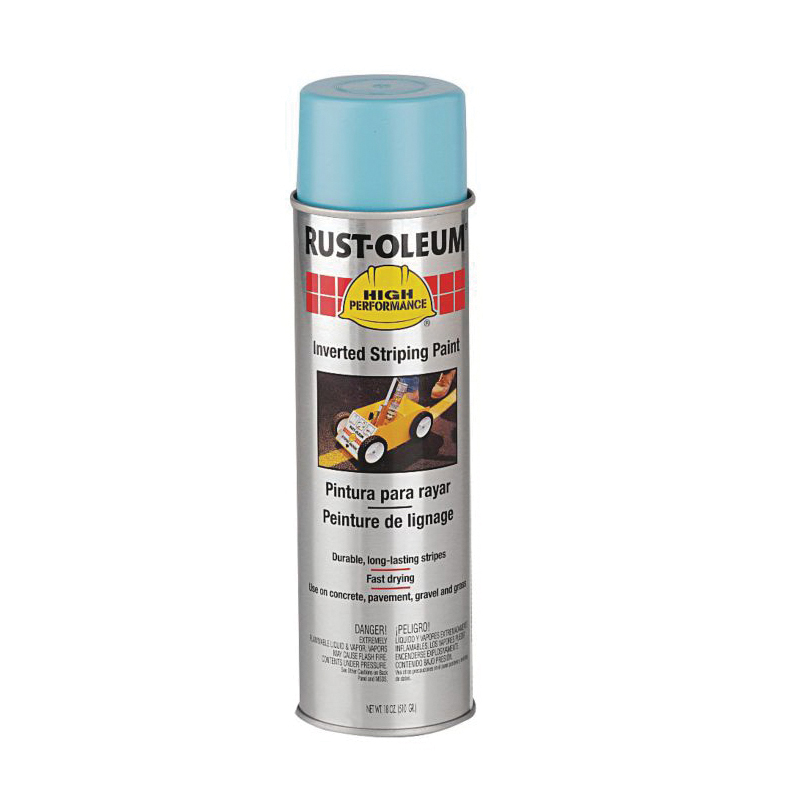 Rust-Oleum® Inverted Striping Paint, High Performance Water Base, Series: 2300 System, 18 oz Container, Aerosol Can Container, Liquid Form, Blue, Matte, 275 to 300 linear ft/gal with 3 in W Stripe Coverage, Chemical Composition: Liquefied Petroleum Gas, Aliphatic Hydrocarbon Toluene, Naphtha, 50 to 100 deg F, 518 g/L VOC, Solvent Like Odor/Scent