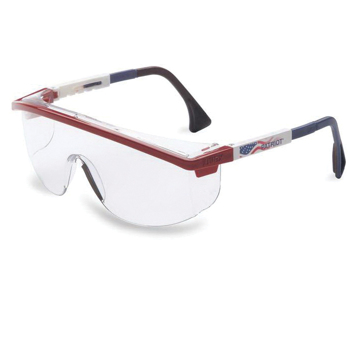 Uvex by Honeywell, S1169, Safety Eyewear, Lightweight, Series: Astrospec 3000, Universal Size, Ultra-Dura Hard Coat Lens Coating, Clear Lens, Full Framed/Wrap Around, Blue/Patriot Red/White Frame, Nylon Frame, Polycarbonate Lens, Yes UV Protection, Duoflex Temple, Specifications Met: ANSI Z87.1-1989, ANSI Z87.1-2003, CSA Z94.3, CA 18828, Military V0