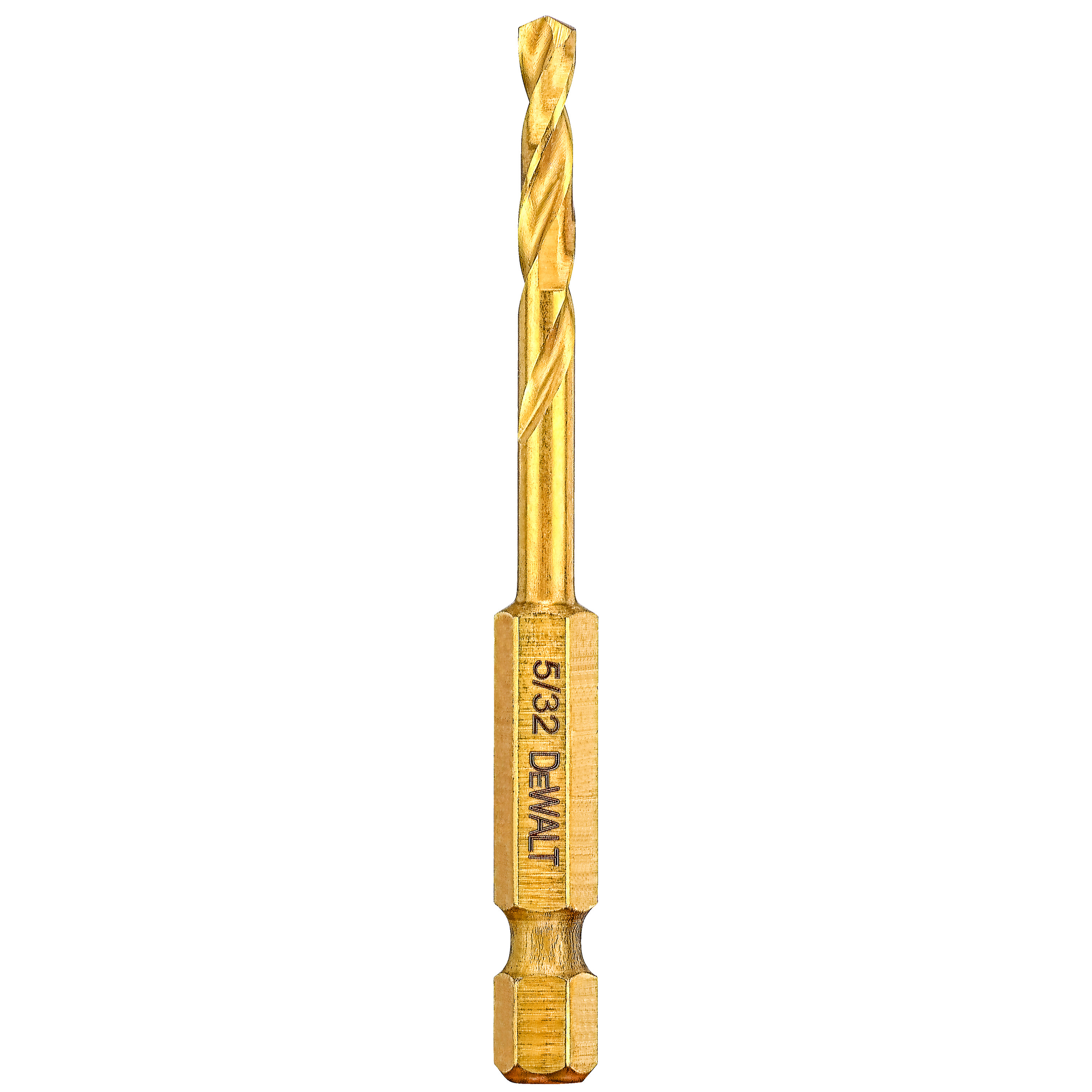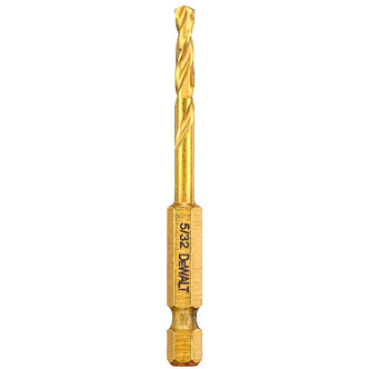 DeWALT® Impact Ready® Hex Shank Drill, Heavy Duty, Series: Impact Ready®, 5/32 in Drill Size - Fraction, 0.1562 in Drill Size - Decimal Inch, 2-13/16 in Overall Length, 1-13/64 in Cutting Depth, Spiral Flute, 1-13/64 in Flute Length, 1/4 in Shank, 135 deg Point, Pilot Point® Point, Right Hand Cutting, HSS Cutting Edge, HSS, Titanium Coated, Applicable Materials: Fiberglass, Metal, PVC and Wood