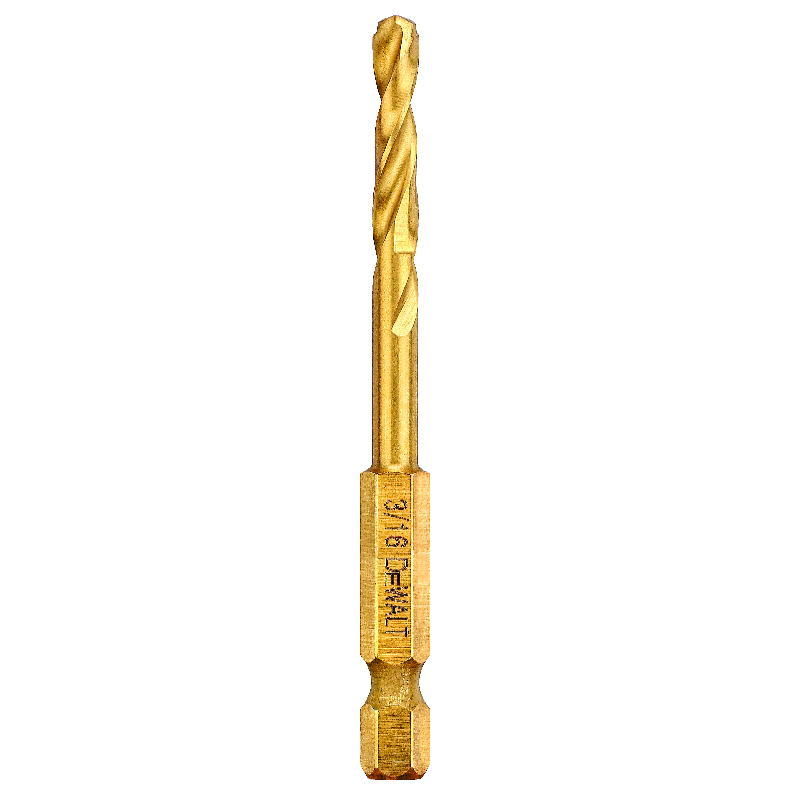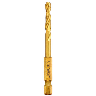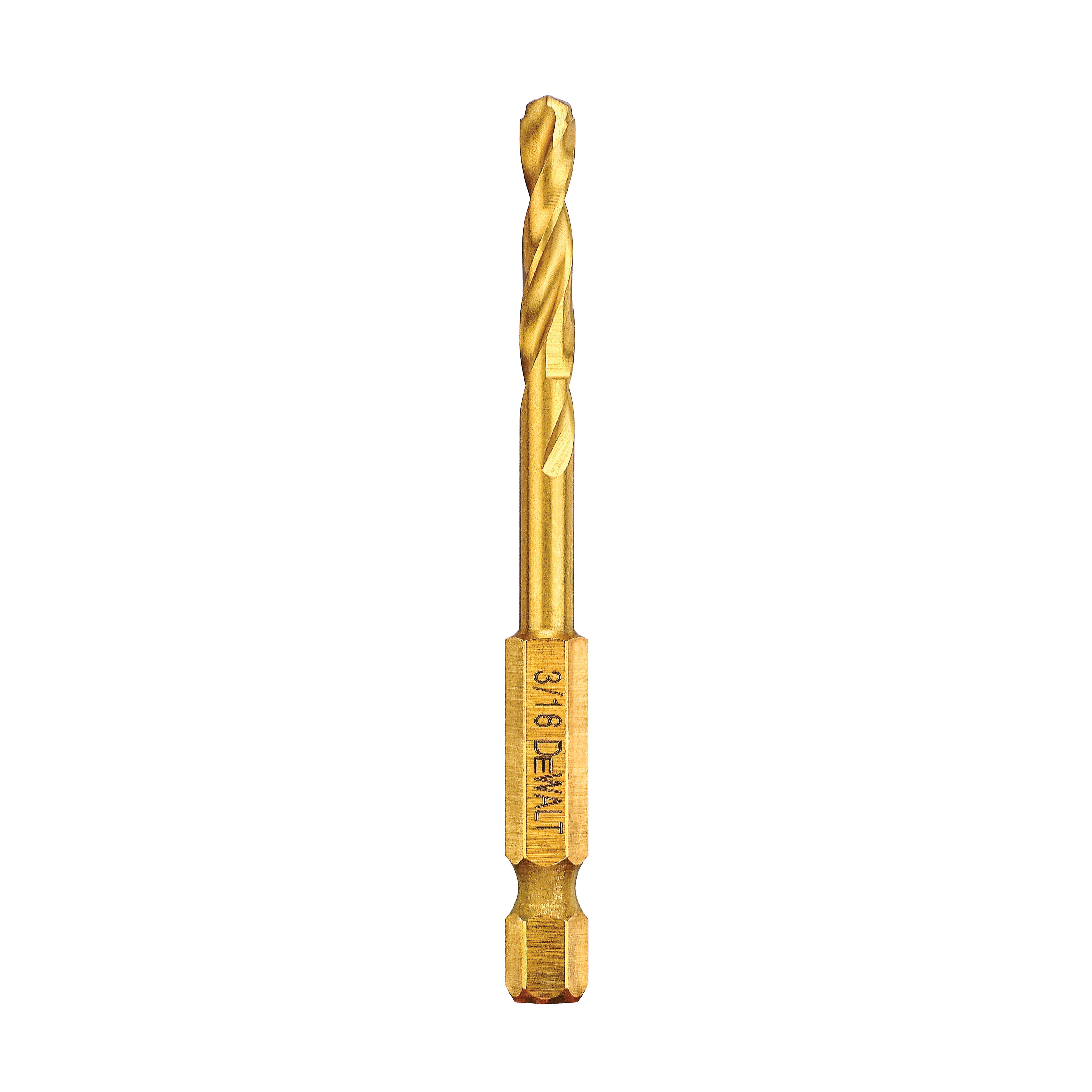 DeWALT® Impact Ready® Hex Shank Drill, Heavy Duty, Series: Impact Ready®, 3/16 in Drill - Fraction, 0.1875 in Drill - Decimal Inch, 3 in Overall Length, 1-13/64 in Cutting Depth, Spiral Flute, 1-13/64 in Flute Length, 1/4 in Shank, 135 deg Point, Pilot Point® Point, Right Hand Cutting Direction, HSS Cutting Edge, HSS, Titanium Coated, Applicable Materials: Fiberglass, Metal, PVC and Wood