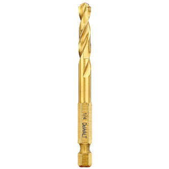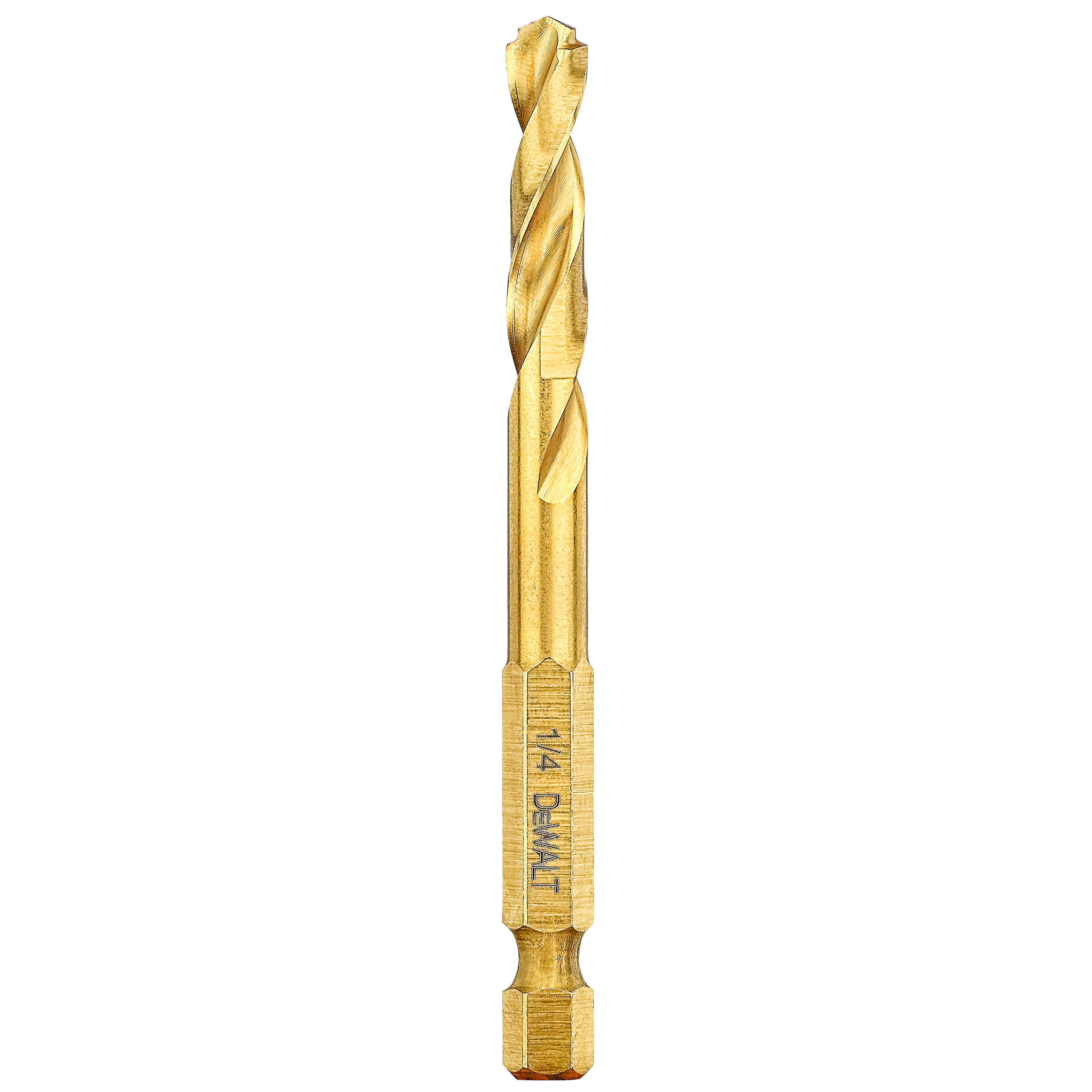 DeWALT® Hex Shank Drill, Heavy Duty, Series: D422, 1/4 in Drill Size - Fraction, 0.25 in Drill Size - Decimal Inch, 3-13/64 in Overall Length, 1-1/2 in Cutting Depth, Spiral Flute, 1-1/2 in Flute Length, 1/4 in Shank, 135 deg Point, Pilot Point® Point, Right Hand Cutting, HSS Cutting Edge, HSS, Titanium Coated, Applicable Materials: Fiberglass, Metal, PVC and Wood