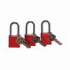 Brady Safety Lockout Padlock, Key Retaining Open Shackle Standard Size, Alike Key, Red, Aluminum Body, 1/4 in Shackle Diameter, 1-1/2 in Shackle Height, Polished Chrome Steel Shackle, 1.6 in Body Length, 1-1/2 in Body Width, 6-Pin Cylindrical Locking Mechanism