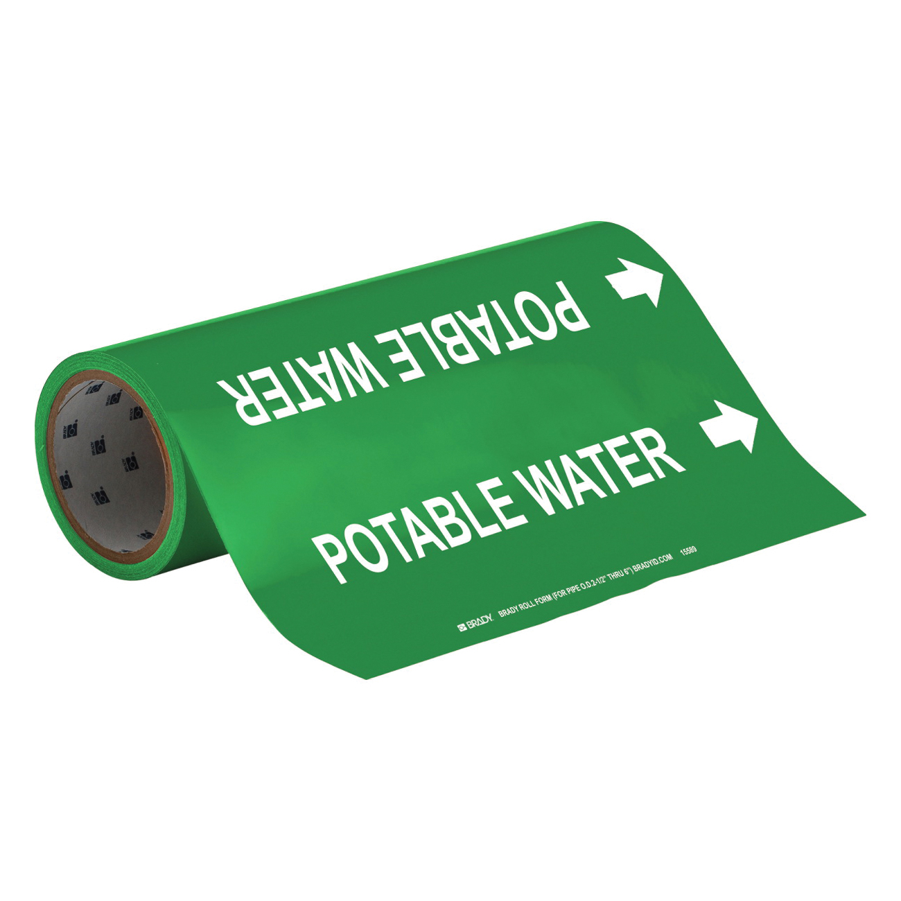 Brady Pipe Marker, Non-Reflective Roll Form Permanent Acrylic, Legend: POTABLE WATER (W/ARROW), White on Green Legend/Background, Fits Pipe Dia: 2-1/2 to 6 in, 30 ft Height, 12 in Width, B-946 Vinyl, Self-Adhesive Mounting