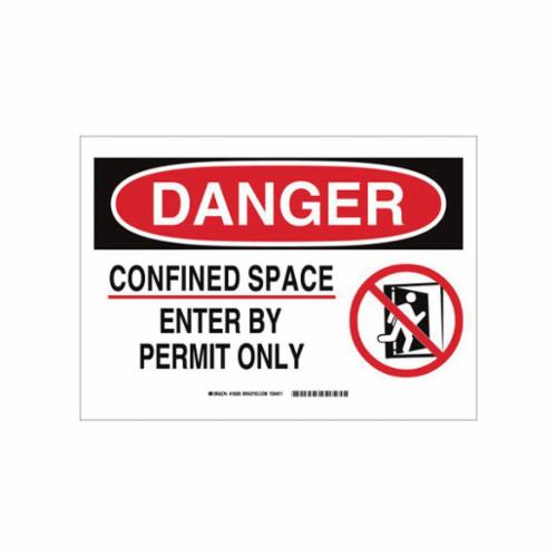 Brady Confined Space Sign, Rectangular, Header: DANGER, Symbol/Text Legend, Legend: CONFINED SPACE ENTER BY PERMIT ONLY, B-401 Polystyrene, Corner Hole Mounting, 10 in Height, 14 in Width, Black/Red on White Legend/Background