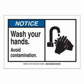 Brady Safety Sign, Rectangular, Language: English, Symbol/Text Legend, Legend: NOTICE AVOID CONTAMINATION WASH YOUR HANDS, B-401 Polystyrene, Corner Hole Mounting, 7 in Height, 10 in Width, Black/Blue on White Legend/Background