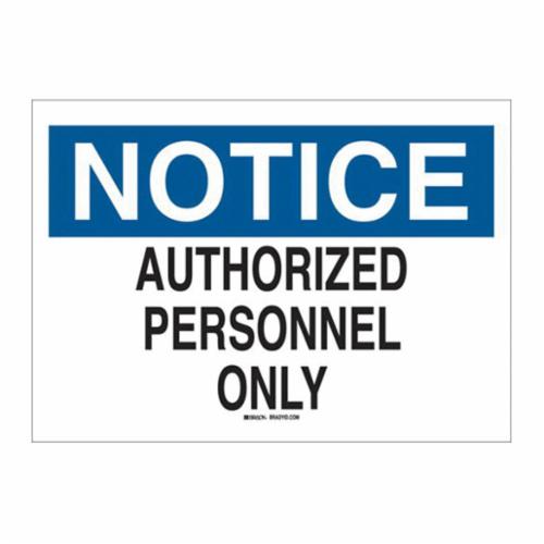 Brady Admittance Sign, Rectangular, Header: NOTICE, Text Legend, Legend: AUTHORIZED PERSONNEL ONLY, B-401 Polystyrene, Corner Hole/Surface Mounting, 7 in Height, 10 in Width, Black/Blue on White Legend/Background