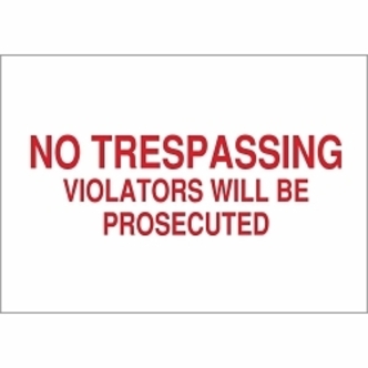 Brady Admittance Sign, Rectangular, Header: NO TRESPASSING, Text Legend, Legend: VIOLATORS WILL BE PROSECUTED, B-401 Polystyrene, Corner Hole/Surface Mounting, 10 in Height, 14 in Width, Red on White Legend/Background