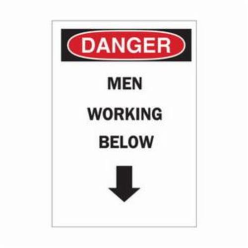 Brady Machine and Equipment Sign, Rectangular, Header: DANGER, Symbol/Text Legend, Legend: MEN WORKING BELOW with Down Arrow Symbol, B-401 Polystyrene, Corner Hole Mounting, 14 in Height, 10 in Width, Black/Red on White Legend/Background