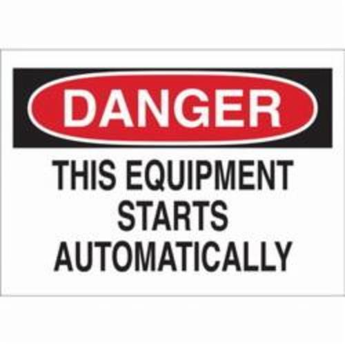 Brady Machine and Equipment Sign, Rectangular, Header: DANGER, Text Legend, Legend: THIS EQUIPMENT STARTS AUTOMATICALLY, B-401 Polystyrene, Corner Hole Mounting, 10 in Height, 14 in Width, Black/Red on White Legend/Background