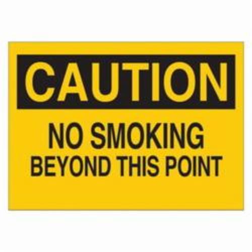Brady No Smoking Sign, Light Duty Rectangular, Header: CAUTION, Text Legend, Legend: NO SMOKING BEYOND THIS POINT, B-401 High Impact Polystyrene, Corner Hole Mounting, 10 in Height, 14 in Width, Black on Yellow Legend/Background