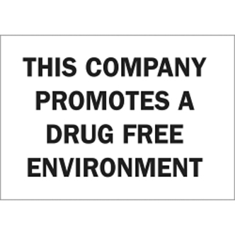 Brady Prohibited Activity Sign, Rectangular, Header: No Header, Text Legend, Legend: THIS COMPANY PROMOTES A DRUG FREE ENVIRONMENT, B-401 Polystyrene, Corner Hole Mounting, 7 in Height, 10 in Width, Black on White Legend/Background