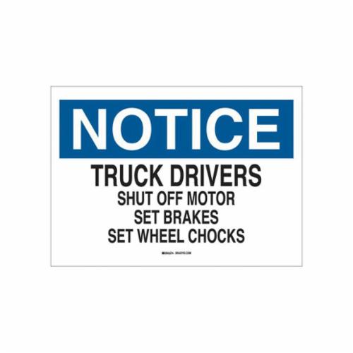 Brady Traffic Control Sign, Rectangular, Header: NOTICE, Text Legend, Legend: TRUCK DRIVERS SHUT OFF MOTOR SET BRAKES SET WHEEL CHOCKS, B-401 Polystyrene, Corner Hole/Surface Mounting, 10 in Height, 14 in Width, Black/Blue on White Legend/Background