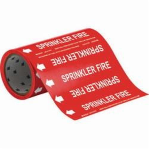 Brady Pipe Marker, Permanent Acrylic, Legend: SPRINKLER FIRE with Left Arrow Symbol, White on Red Legend/Background, 8 in Height, 8 in Width, B-946 Vinyl, Self-Adhesive Mounting, 65 Markers per Card