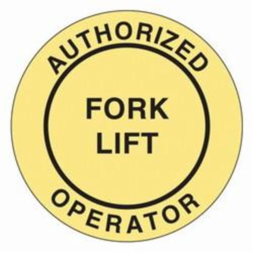 Brady Emblem Label, Circular Non-Reflective Self-Adhesive, Legend: AUTHORIZED OPERATOR FORK LIFT, Black on Yellow Legend/Background, B-946 Adhesive Vinyl Film, For Use With: Hard Hat, 4 per Card Labels