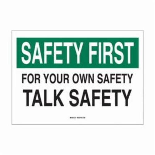 Brady Safety Awareness and Compliance Banner, Rectangular, Header: SAFETY FIRST, Text Legend, Legend: FOR YOUR OWN SAFETY TALK SAFETY, B-555 Aluminum, Corner Hole Mounting, 10 in Height, 14 in Width, Black/Green on White Legend/Background
