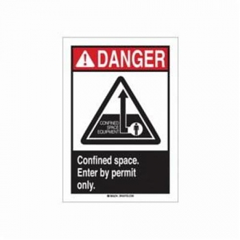 Brady Danger Safety Sign, Laminated Rectangular, Symbol/Text Legend, Legend: DANGER CONFINED SPACE. ENTER BY PERMIT ONLY., B-302 Polyester, Self-Adhesive Mounting, 10 in Height, 7 in Width, Black/Red on White Legend/Background