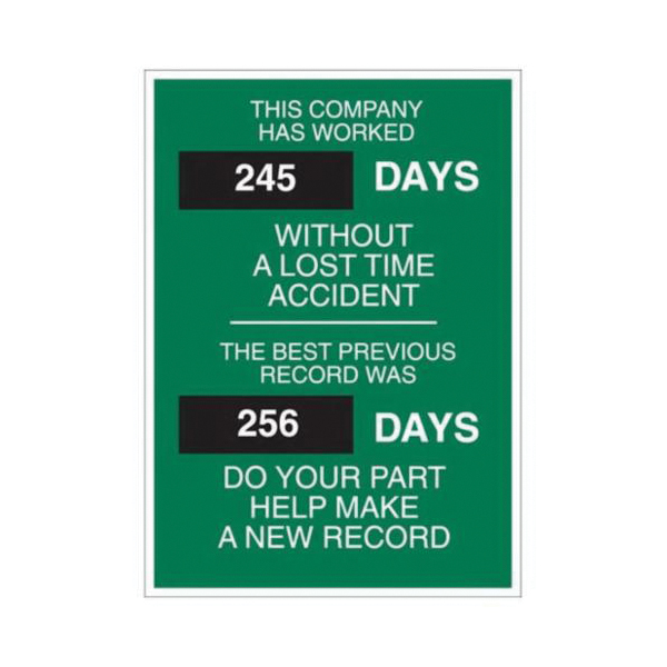 Brady Scoreboard Sign, Rectangular, Header: No Header, Language: English, Legend: THIS COMPANY HAS WORKED ___ DAYS WITHOUT A LOST TIME ACCIDENT THE BEST PREVIOUS RECORD WAS ___ DAYS DO YOUR PART HELP MAKE A NEW RECORD!, 20 ga Steel, Hardware Mounting, 28 in Height, 20 in Width, Black/White on Green Legend/Background