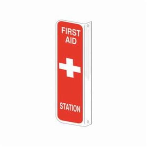 Brady Safety Sign, Rectangular, Symbol/Text Legend, Legend: FIRST AID STATION, B-401 Polystyrene, Corner Hole/Surface Mounting, 4 in Height, 12 in Width, White on Red Legend/Background