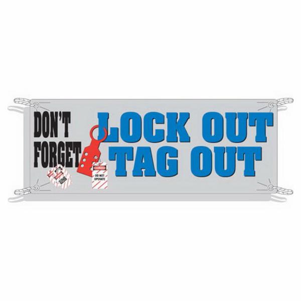 Brady Lockout Tagout Banner, Rectangular, Symbol/Text Legend, Legend: DONT FORGET LOCK OUT TAG OUT, B-450 Polyethylene, Corner Hole Mounting, 3.5 ft Height, 10 ft Width, Black/Blue/Red on Gray Legend/Background