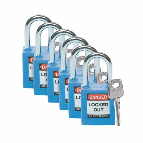 Brady Safety Padlock, Anti-Spark Key Retaining, Different Key, Blue, Fiberglass Reinforced Nylon Body, 1/4 in Shackle Diameter, 1-1/2 in Shackle Height, 0.8 in Shackle Width, Triple Coated Hardened Steel Shackle, 1-3/4 in Body Length, 1-1/2 in Body Width, 6-Pin Cylindrical Locking Mechanism, Legend: DANGER LOCKED OUT DO NOT REMOVE, Non-Conductive Conductivity