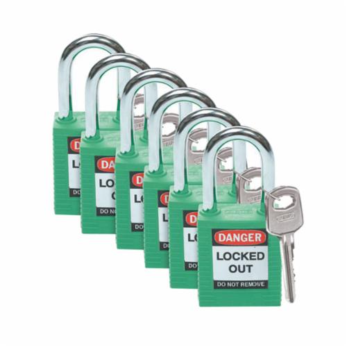 Brady Safety Padlock, Anti-Spark Key Retaining, Different Key, Green, Fiberglass Reinforced Nylon Body, 1/4 in Shackle Diameter, 1-1/2 in Shackle Height, 0.8 in Shackle Width, Triple Coated Hardened Steel Shackle, 1-3/4 in Body Length, 1-1/2 in Body Width, 6-Pin Cylindrical Locking Mechanism, Legend: DANGER LOCKED OUT DO NOT REMOVE, Non-Conductive Conductivity