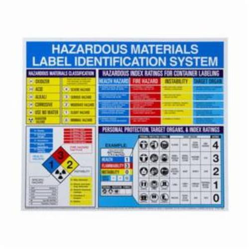 Brady Chemical and Hazardous Material Sign, Laminated Rectangular, Language: English, Symbol/Text Legend, Legend: (HAZARDOUS MATERIALS LABEL IDENTIFICATION SYSTEM), Plastic, Hole Mounting, 22 in Height, 26 in Width, Black/Blue/Red/Yellow on White Legend/Background