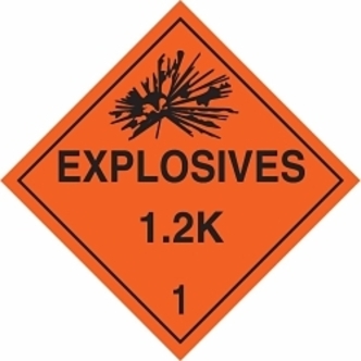 Brady DOT Vehicle Placard, Diamond, Legend: EXPLOSIVES 1.2K 1, Black on Orange Legend/Background, 10-3/4 in Height, 10-3/4 in Width, B-120 Fiberglass, Class: 1.2K, Corner Hole Mounting