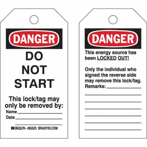 Brady Lockout Tag, Rectangular, Legend: Front: DANGER: DO NOT START This lock/tag may only be removed by: Name:______Date:______Back: This energy source has been LOCKED OUT! Only the individual who signed the reverse side may remove this lock/tag. REMARKS:_______, Black/Red on White Legend/Background, 5-3/4 in Height, 3 in Width, B-853 Cardstock, 3/8 in Hole, Rolled Brass Grommet, 50 lb Withstand Pull Force
