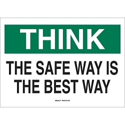 Brady Safety Awareness and Compliance Banner, Rectangular, Header: THINK, Text Legend, Legend: THE SAFE WAY IS THE BEST WAY, B-120 Fiberglass, Corner Hole Mounting, 10 in Height, 14 in Width, Black/Green on White Legend/Background