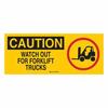 Brady Forklift and Warehouse Traffic Sign, Rectangular, Header: CAUTION, Symbol/Text Legend, Legend: WATCH OUT FOR FORK LIFT TRUCKS, B-120 Fiberglass, Corner Hole Mounting, 7 in Height, 17 in Width, Black/Red on Yellow Legend/Background