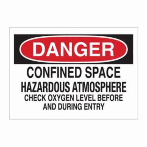 Brady Confined Space Sign, Laminated Rectangular, Header: DANGER, Text Legend, Legend: CONFINED SPACE HAZARDOUS ATMOSPHERE CHECK OXYGEN LEVEL BEFORE AND DURING ENTRY, B-302 Polyester, Self-Adhesive Mounting, 7 in Height, 10 in Width, Black/Red on White Legend/Background
