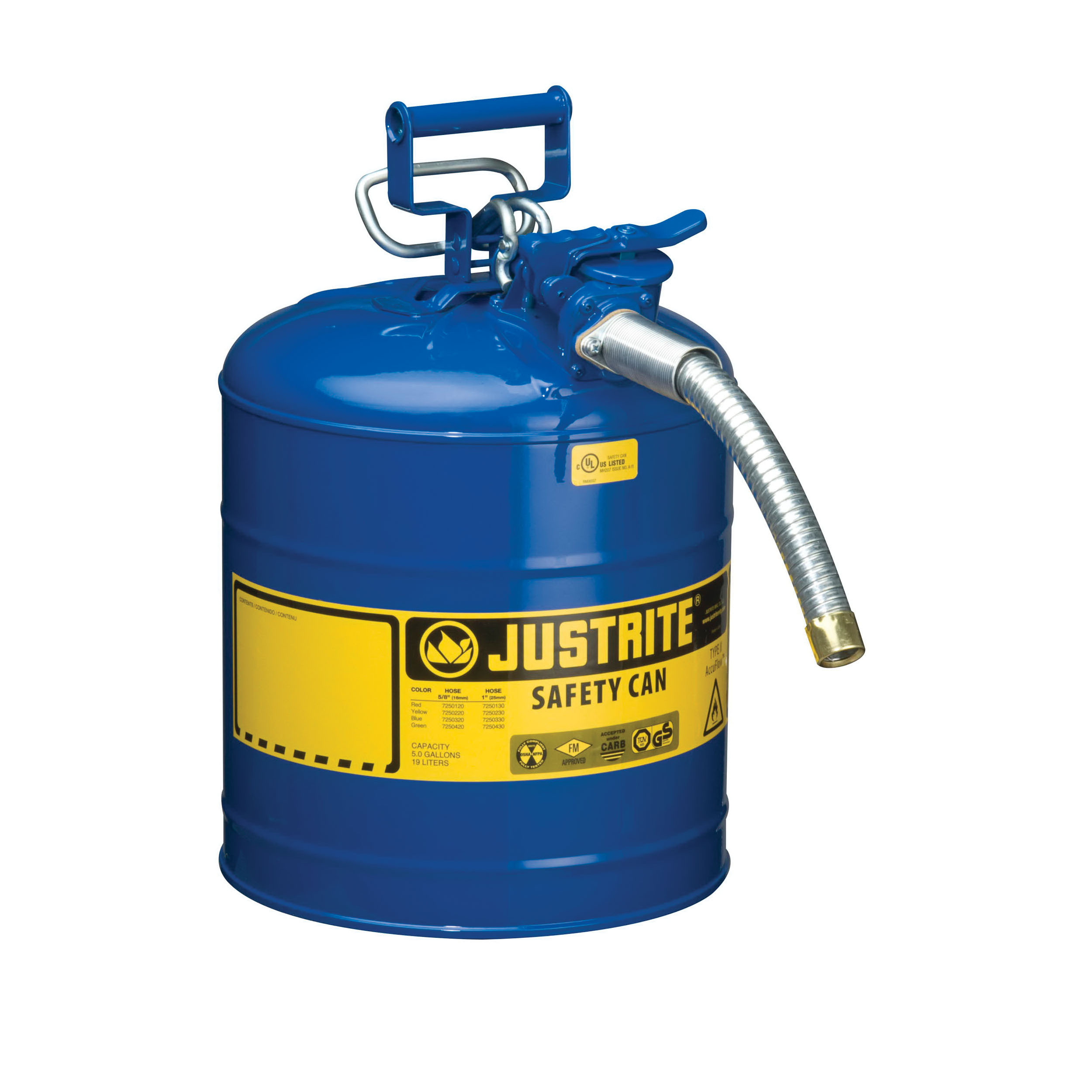 Justrite Accuflow 7250330 Type II Safety Can With 1 in OD x 9 in L Metal Hose and Stainless Steel Flame Arrester, 5 gal Capacity, 11-3/4 in Dia x 17-1/2 in H, Steel, Blue